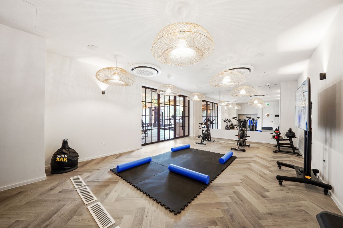What sets this development apart is the scale and quality of its communal spaces. The building is vertically stacked with lifestyle zones, connected by a central glass lift that reveals co-working floors, wellness areas and social lounges as you move through the building.