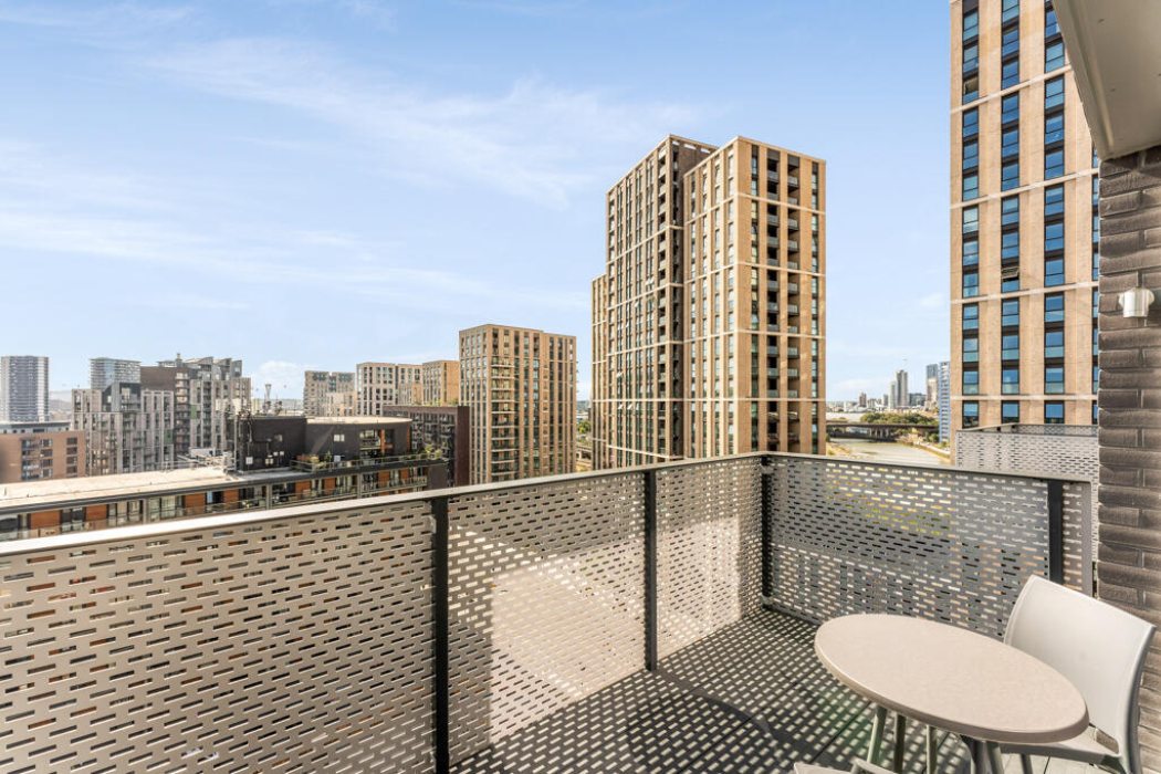 Open-plan living areas create a clean, adaptable layout, while large windows and private balconies in many homes bring in light and outward views across Canning Town and the Royal Docks.