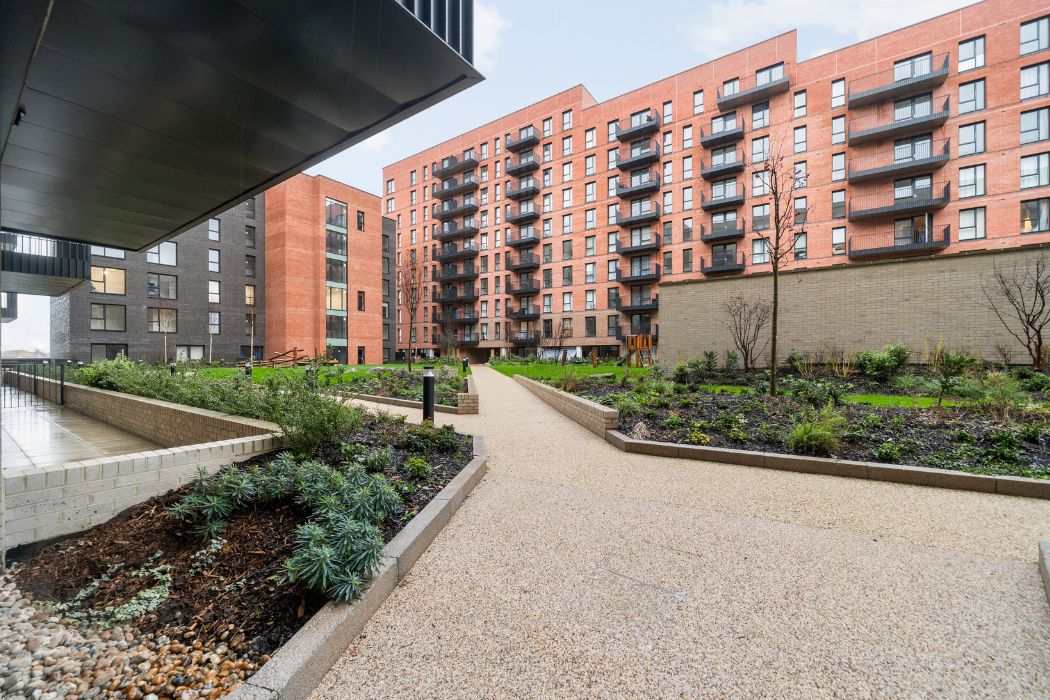 Communal gardens and pathways at Hayes Village residential development
